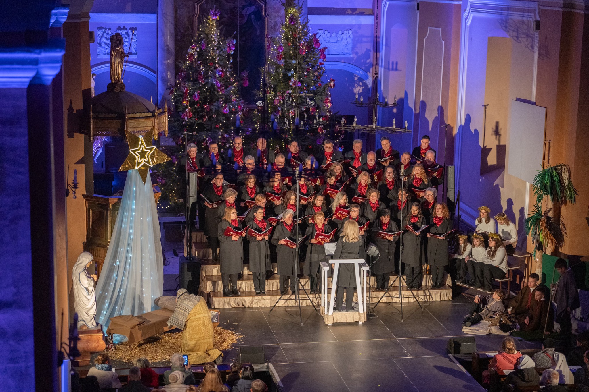 A kétezer éves történet rendhagyó módon egyszer csak átfordult a mába, ahol a gyermekek születésnapi dallal köszöntötték Jézust, majd Regösök érkeztek a Szent családhoz, végül elhangoztak olyan népszerű amerikai slágerek is, mint a Jingle bells és a Rocking around the christmas tree. A közönség a szereplőkkel együtt énekelte a Felis navidad-ot, a Mennyből az angyalt és a Csendes éj közismert dallamait.